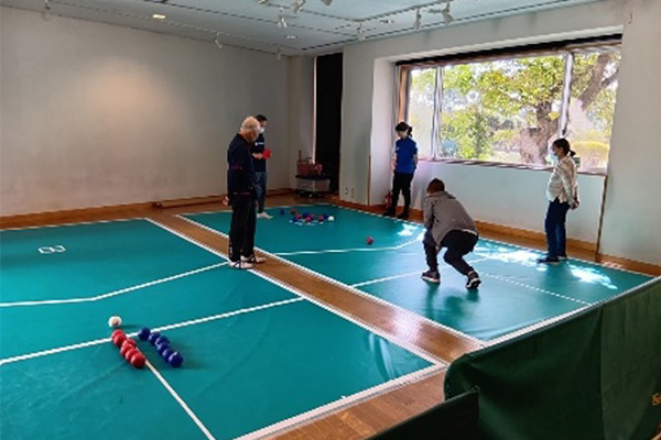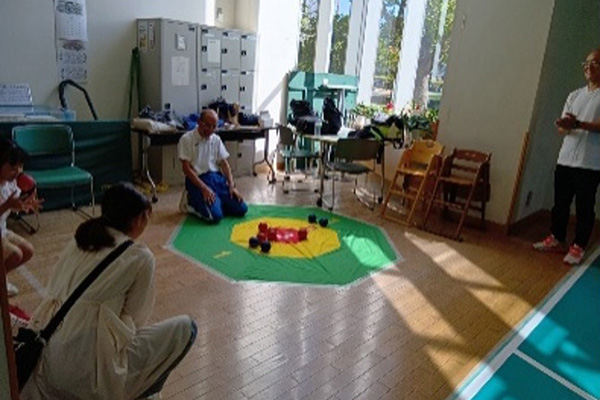 ○複数の会場で開催されたふれあいまつりですが、生涯学習交流センターの1階にボッチャ体験コーナーを設置しました。小さい子どもさんは、「八角的」という布製の的に向けてボッチャを投げる活動に取り組みました。